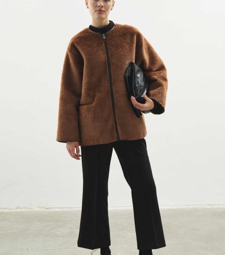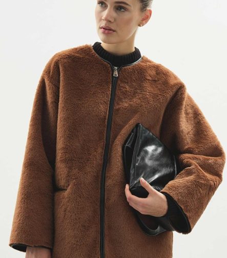 Contrast Leather Trimmed Plush Coffee Brown Coat