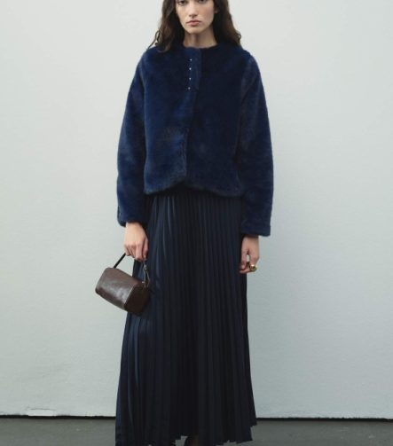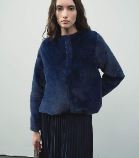 Short Button Navy Blue Plush Jacket