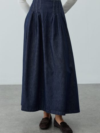A maxi-length skirt crafted from denim woven fabric, featuring a high waist, prominent stitching, pleated details, and a hidden zipper