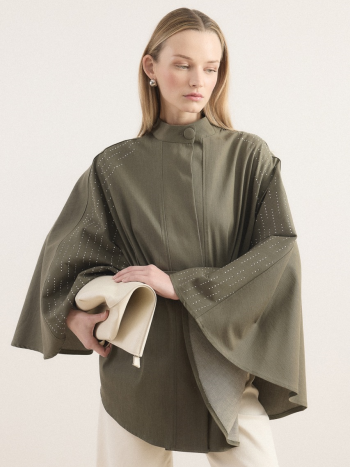 Stone-Embellished Denim Poncho – Khaki