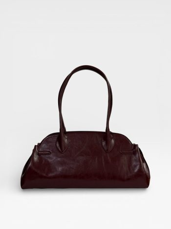 Oval hatlı, çatlak efektli deriden, kenarları ince kemer detaylı, fermuar kapamalı, geniş omuz çantası.