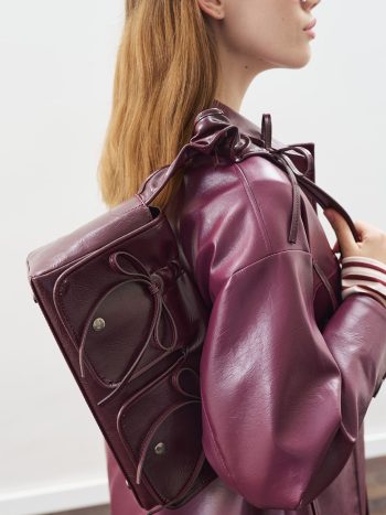 Medium size bag with ribbon detail, featuring interior pocket detail, magnetic closure, faux leather, lined. Main material: 100% Polyurethane Lining: