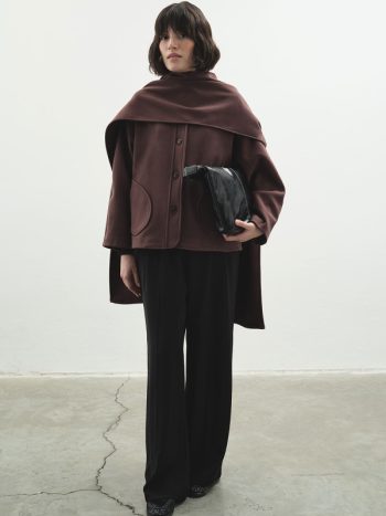 FEATURES: Cashmere-look hooded burgundy coat with a stand-up collar, front button closure, external pocket details, dropped shoulders. Includes a matching