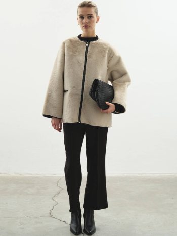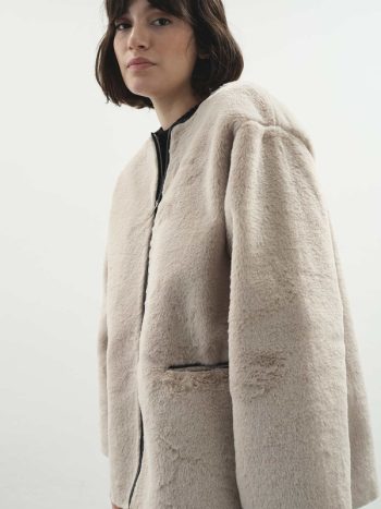 CONTRAST LEATHER TRIMMED FAUX FUR BEIGE COAT FEATURES Stand collar, zipper closure, front pockets, includes optional patch pocket that can