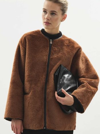 FEATURES OF THE CONTRAST LEATHER TRIMMED PLUSH COFFEE BROWN COAT Bike collar, zip closure, front pockets, includes a detachable pocket