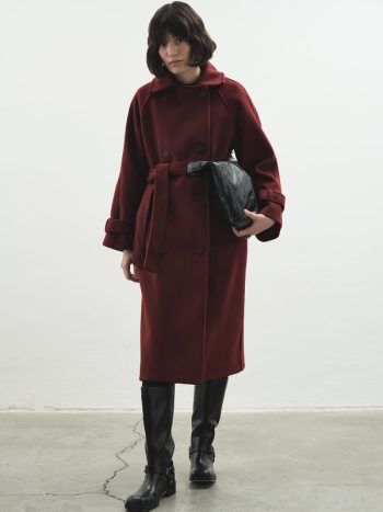 PREMIUM BURGUNDY DOUBLE-BREASTED CASHMERE COAT FEATURES Double-breasted collar, front button closure, pockets, self-fabric belt with buckle closure, back vent detail,
