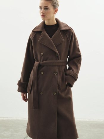PREMIUM COFFEE BROWN DOUBLE-BREASTED TRENCH COAT FEATURES Double-breasted lapel collar, front button closure, pockets, self-fabric belt with buckle closure, back
