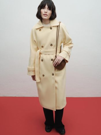 FEATURES OF THE PREMIUM YELLOW TRENCH COAT WITH CROSSOVER DESIGN Crossover collar, button-front closure, pockets, self-fabric belt with buckle closure,