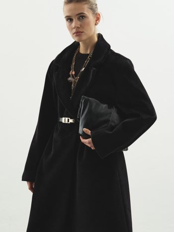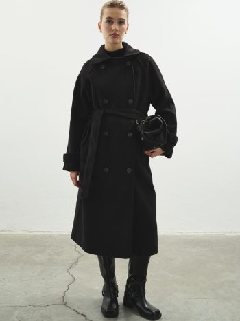 FEATURES OF THE LONG DOUBLE-BREASTED CASHMERE BLACK COAT: Jacket collar, double-breasted closure, hidden button detailing, side pockets, belt accessory, regular