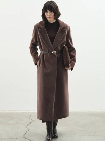 FEATURES OF THE LONG DOUBLE-BREASTED CASHMERE COFFEE COAT: Jacket collar, double-breasted closure, hidden button detail, side pockets, belt accessory, regular