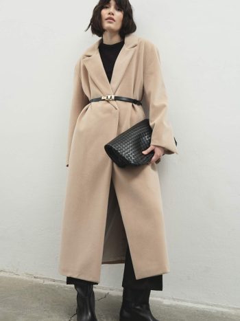 LONG WRAP-OVER CASHMERE STONE COAT FEATURES Jacket collar, wrap-over closure, hidden button detailing, side pockets, belt accessory, regular fit, lined
