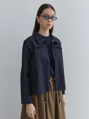 İnce dokuma denim kumaştan, önü rüzgarlık detaylı, fermuar kapamalı, etek ucu tünel ve içten britli, uzun kollu, manşetli ceket. 1(36-38)
