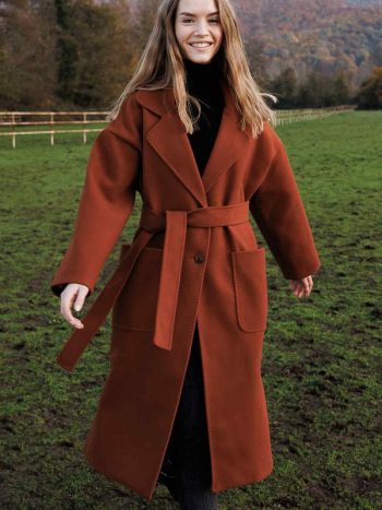 PUNTO DİKİŞLİ KİREMİT KABAN ÖZELLİKLERİ Kruvaze yaka, düğme kapamalı, büyük cep detaylı, kendi kumaşından kuşaklı, rahat kalıp, astarlı punto dikişli