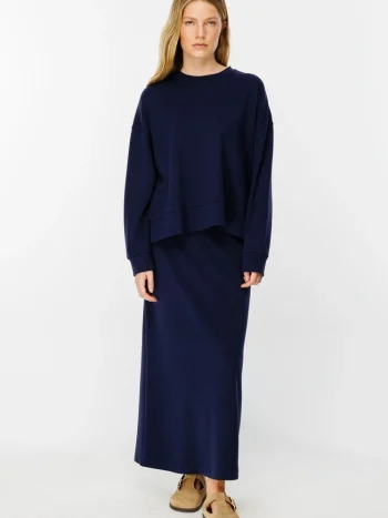 Features of the Compact Sweatshirt with Side Slits: Collarless design, dropped shoulders, side slits, and cuff-detailed hem. Made from comfortable