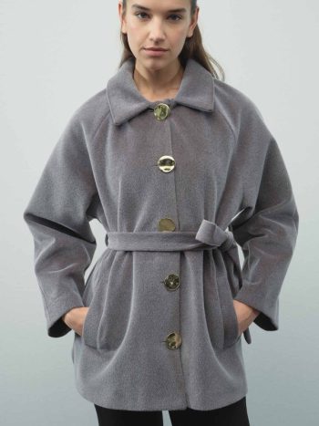MILENA GOLD BUTTONED SMOKE-COLORED JACKET COAT FEATURES: Shirt collar, front button closure, belted with bridge detail, self-fabric waist belt, pockets,