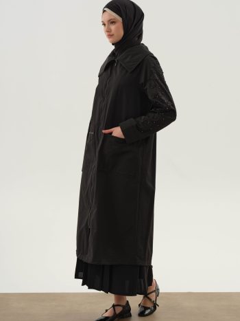 This trench coat stands out with its carefully designed ensemble pieces and embroidered sleeves, offering a sophisticated style. Its combined