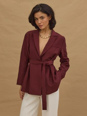 This jacket offers a feminine silhouette with its elegant jacquard texture and belt detail, emphasizing style. It provides a wide