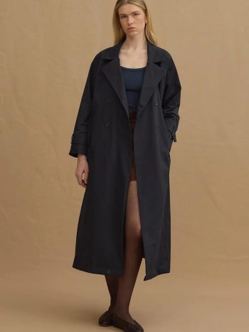 The lines emphasized with piping enhance the form of the trench coat while highlighting its elegance. Completed with functional details