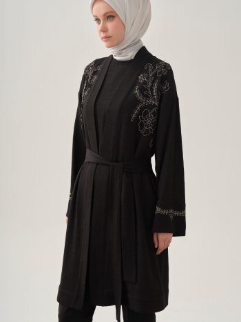 This jacket and blouse set, adorned with elegant embroidery details, offers a complete and impressive look. Its matching pieces provide