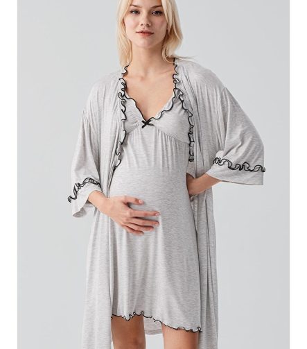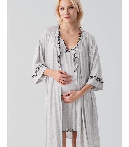 Gray Strappy Short Stretchy Elastane Viscose Soft Maternity Robe Nightwear Set 19400