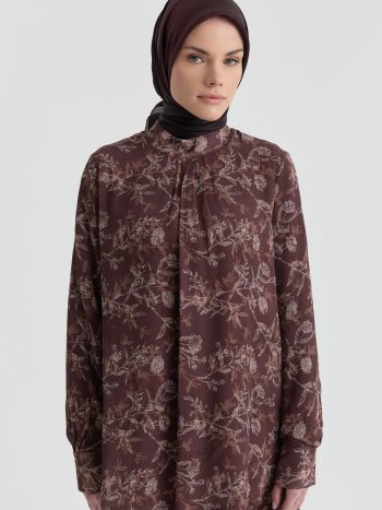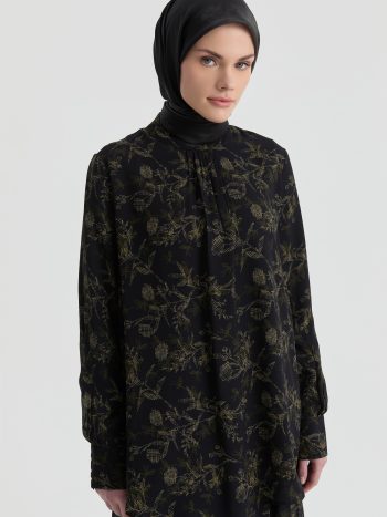 This tunic features an elegant and functional drawstring detail at the neckline, adding movement to the design while its flowing