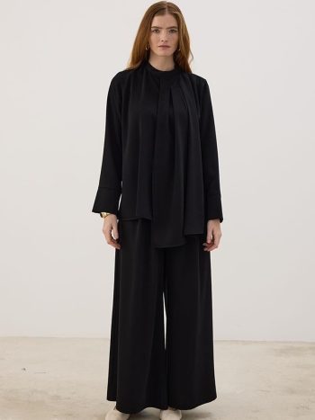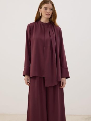This blouse creates subtle movement on the surface with pleated details, transforming its simple form into sculptural aesthetics. Its fluid