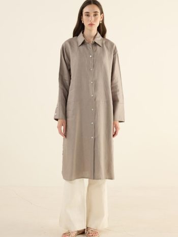 This long khaki tunic offers a natural and breezy look, making it one of the lightweight and chic pieces for