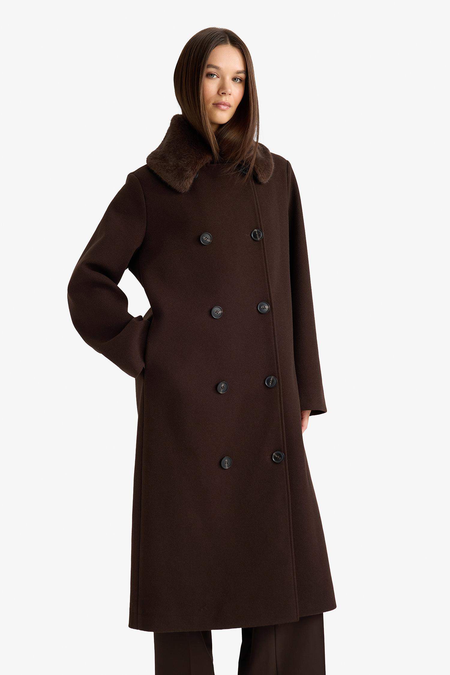 Afra x DeFacto Detachable Faux Fur Collar Regular Fit Buttoned Pocket Long Trench Coat