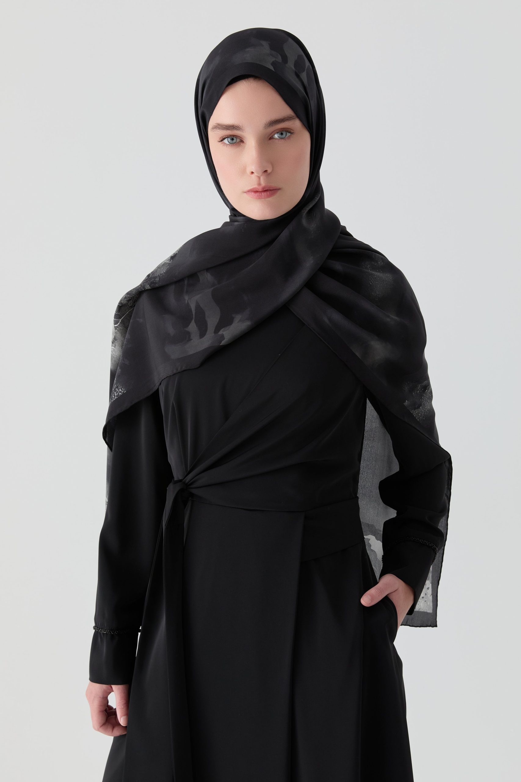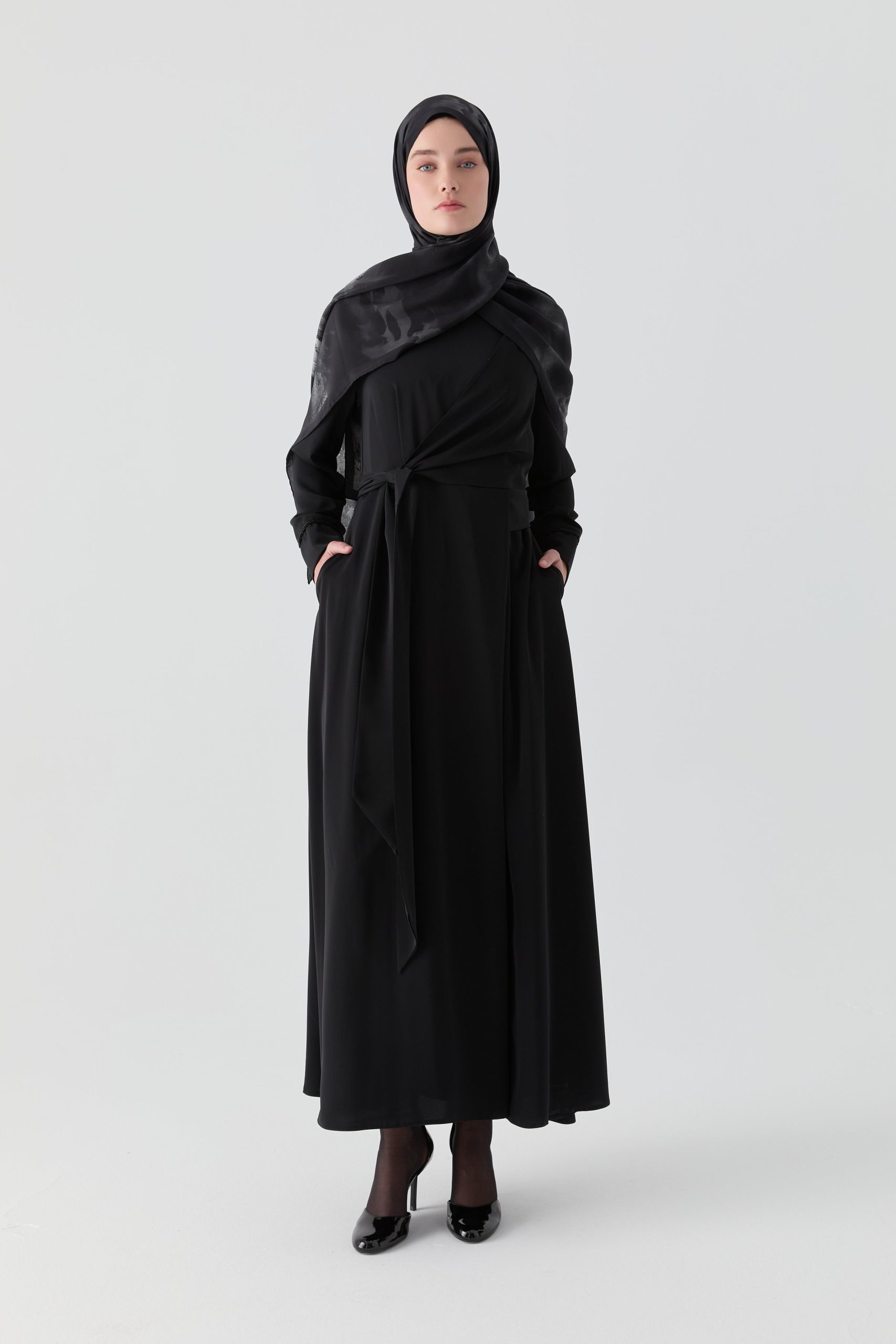 Tags: black dress, elegant silhouette, long sleeve, modern fashion, patchwork dress, polyester dress, tie-wrap