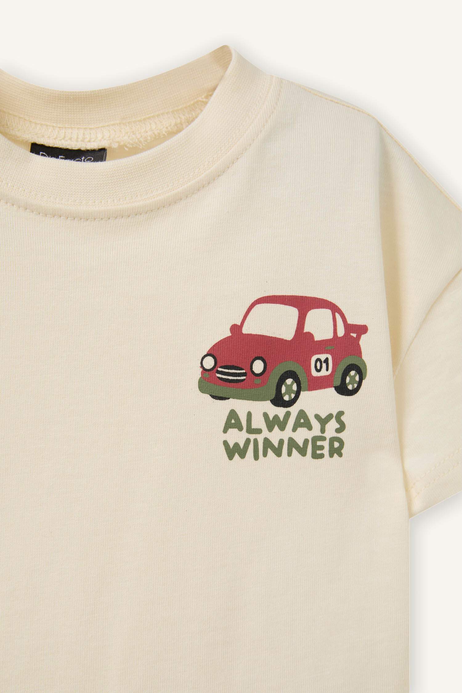 A stylish and comfortable 2-piece set for babies; consists of a soft cream short-sleeved t-shirt and an adjustable strap romper. Its breathable fabric ensures all-day comfort for your little ones.