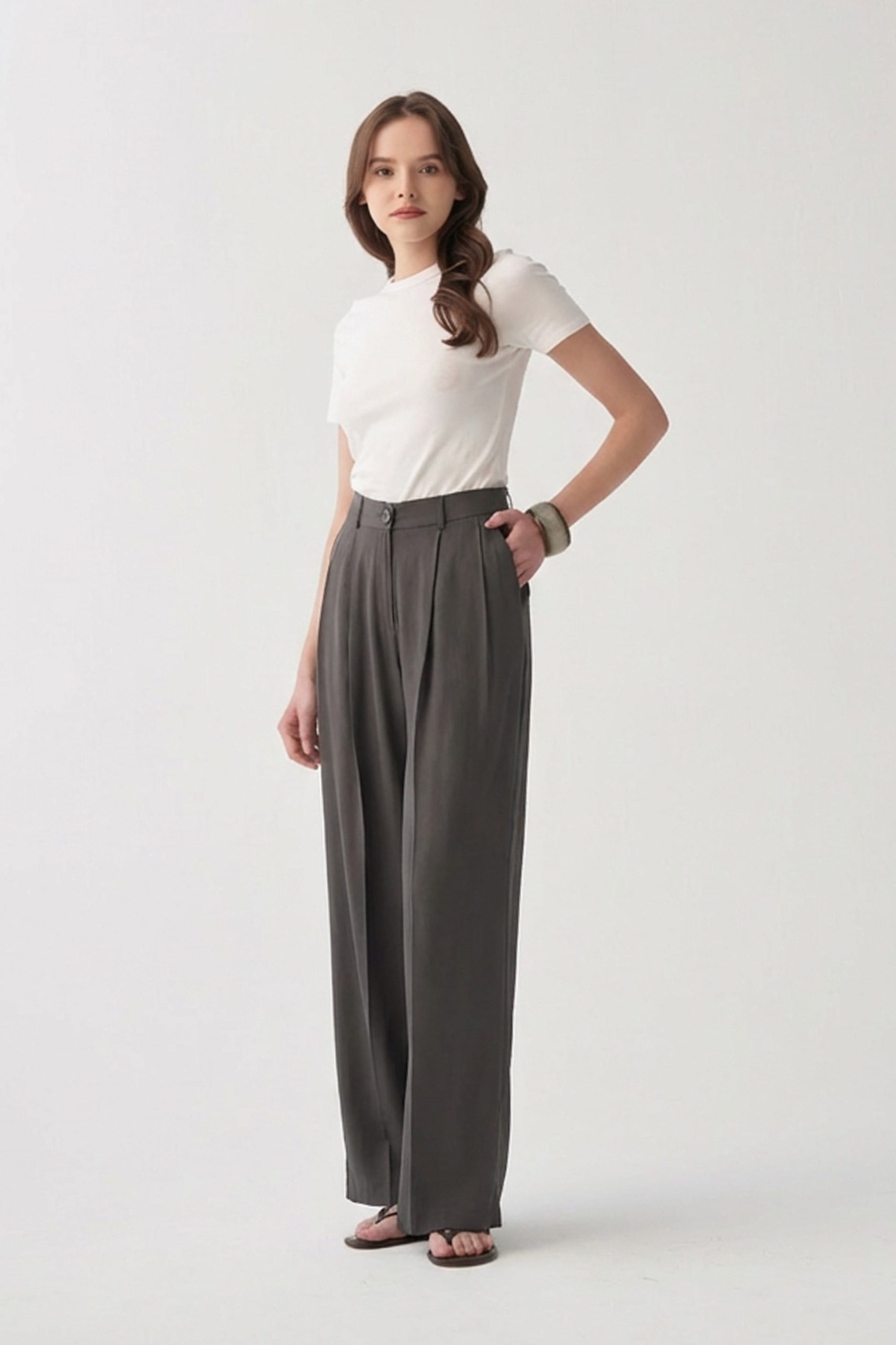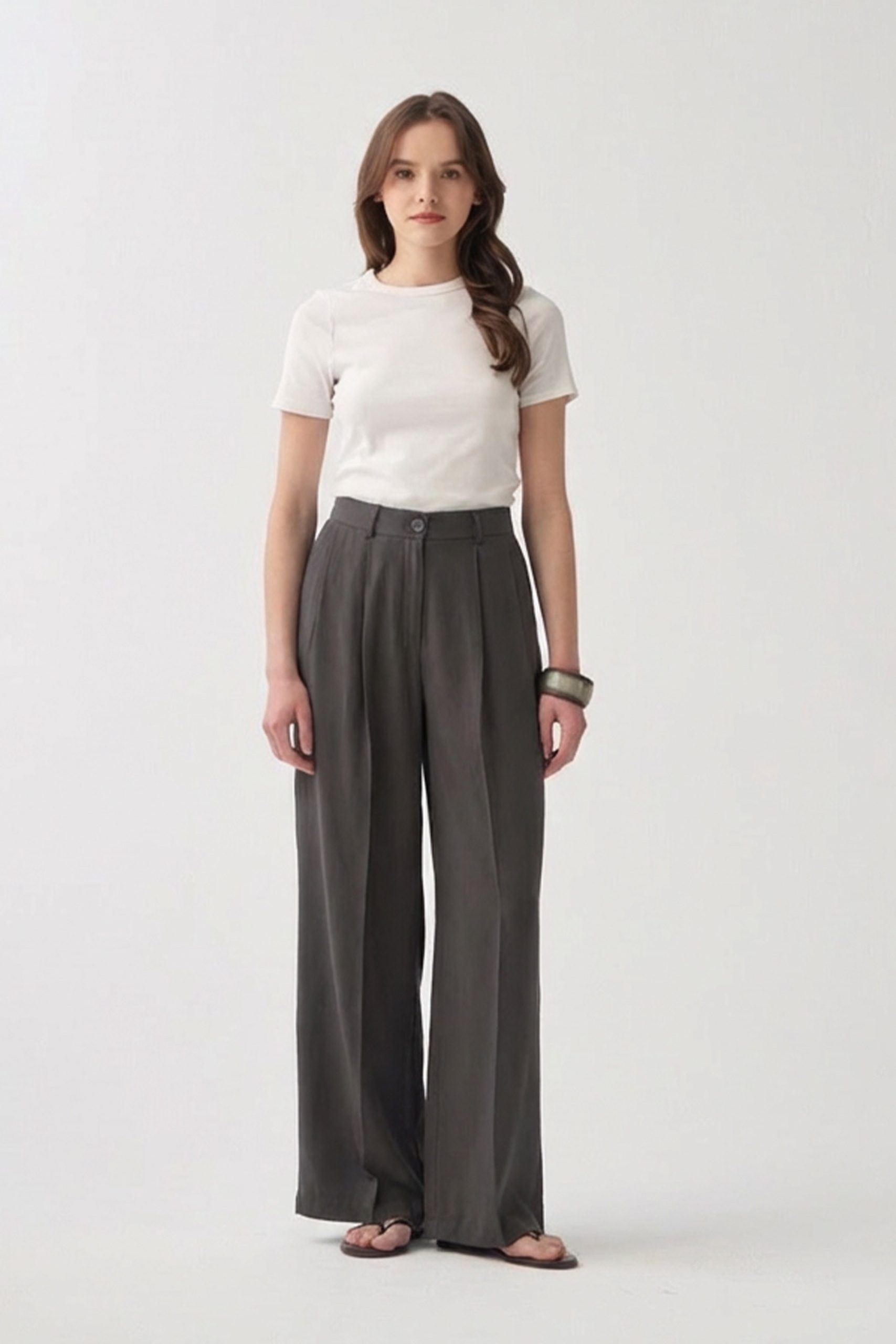 Tags: anthracite, elegant wear, palazzo pants, press detail, summer fashion, viscose blend, wide leg trousers