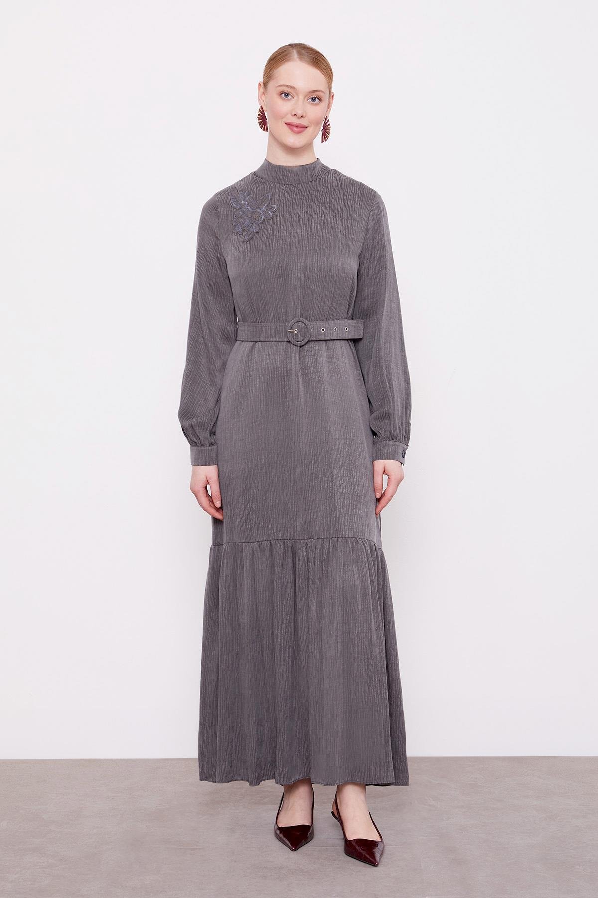 Anthracite Shoulder Embroidered Detail Crepe Dress