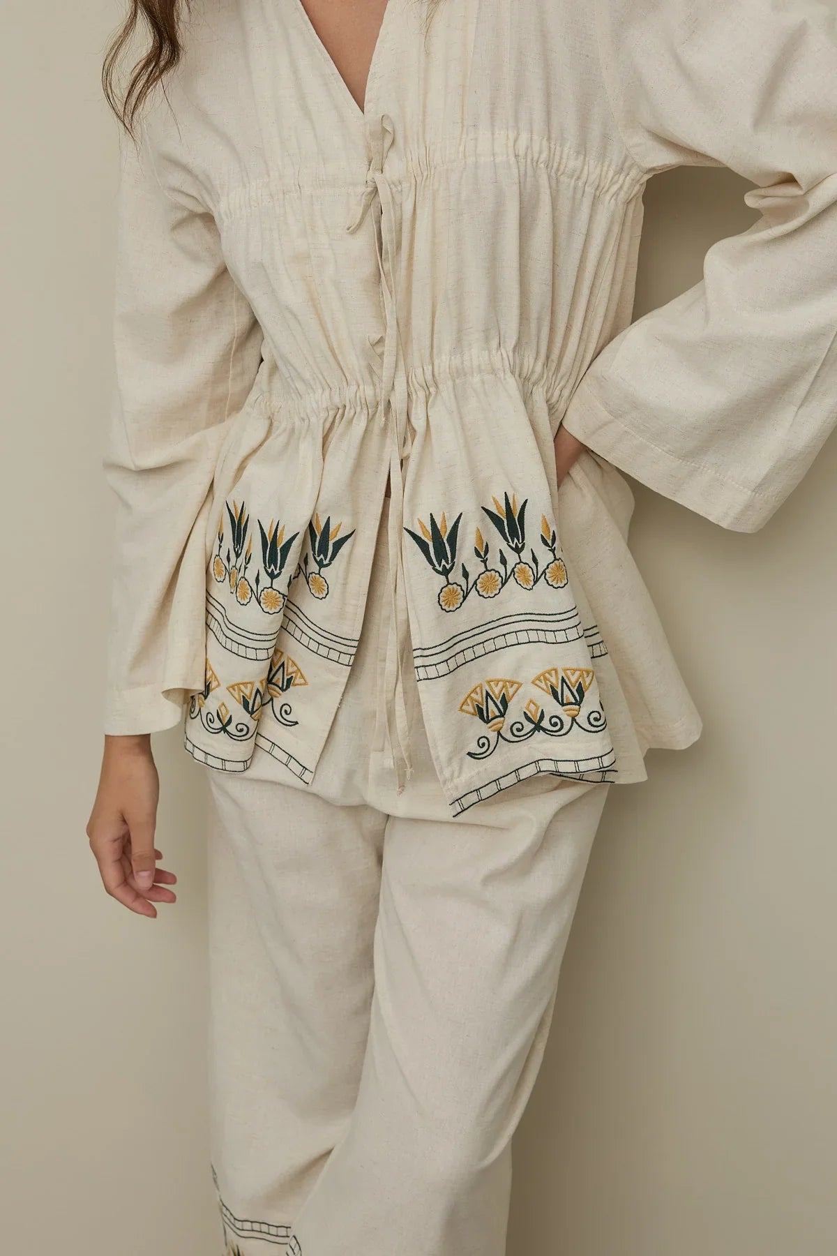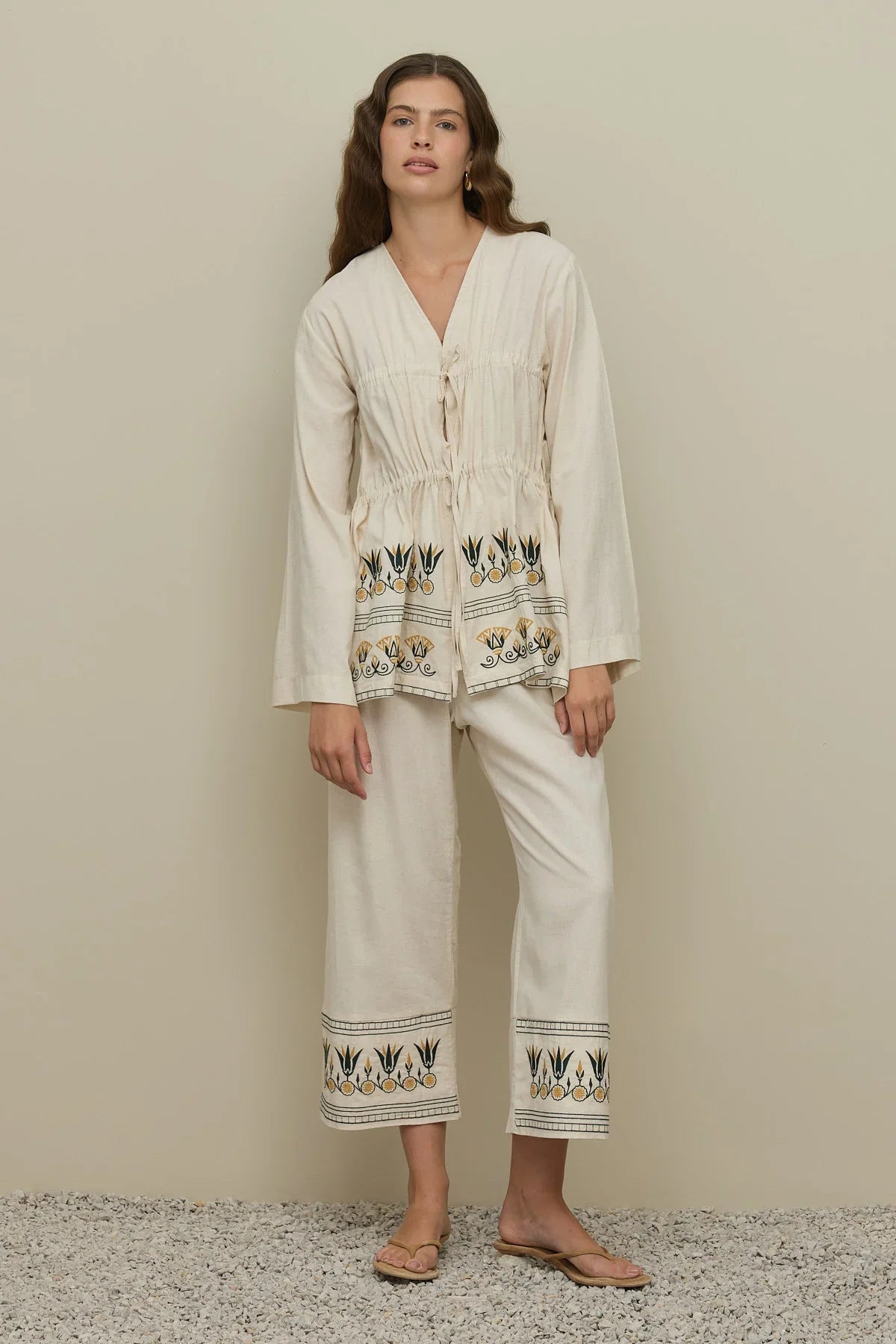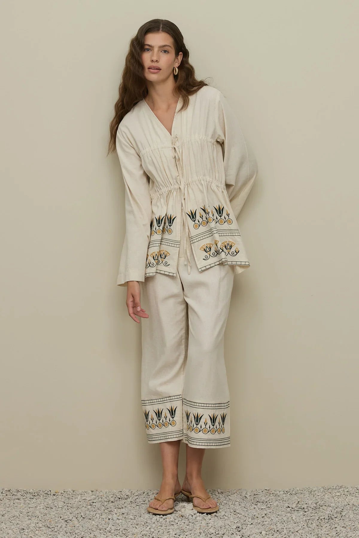 Featuring a front gathered detail, a fabric blend of linen, embroidered details, a wide-sleeved kimono, and culotte-style pants with embroidered hems.