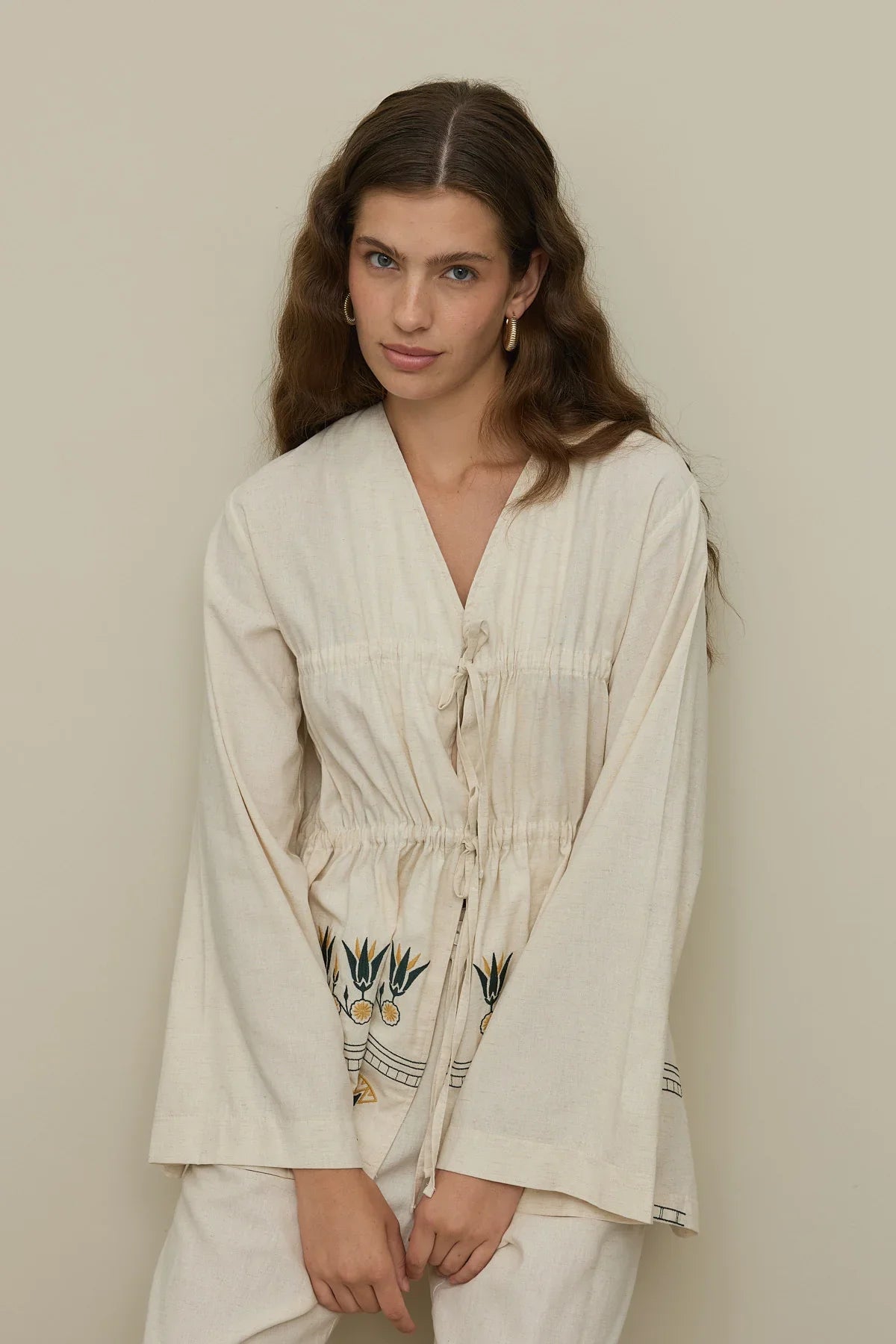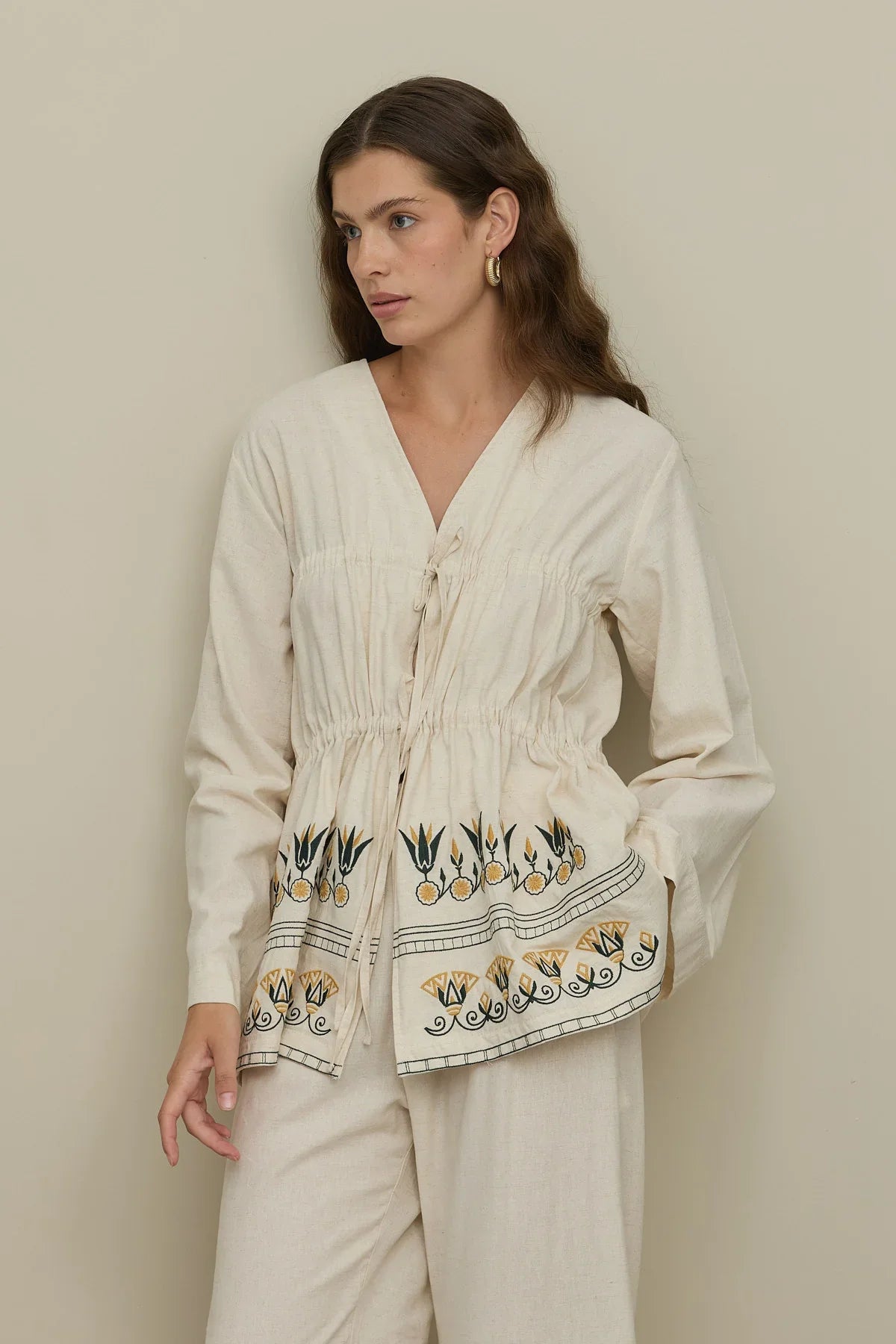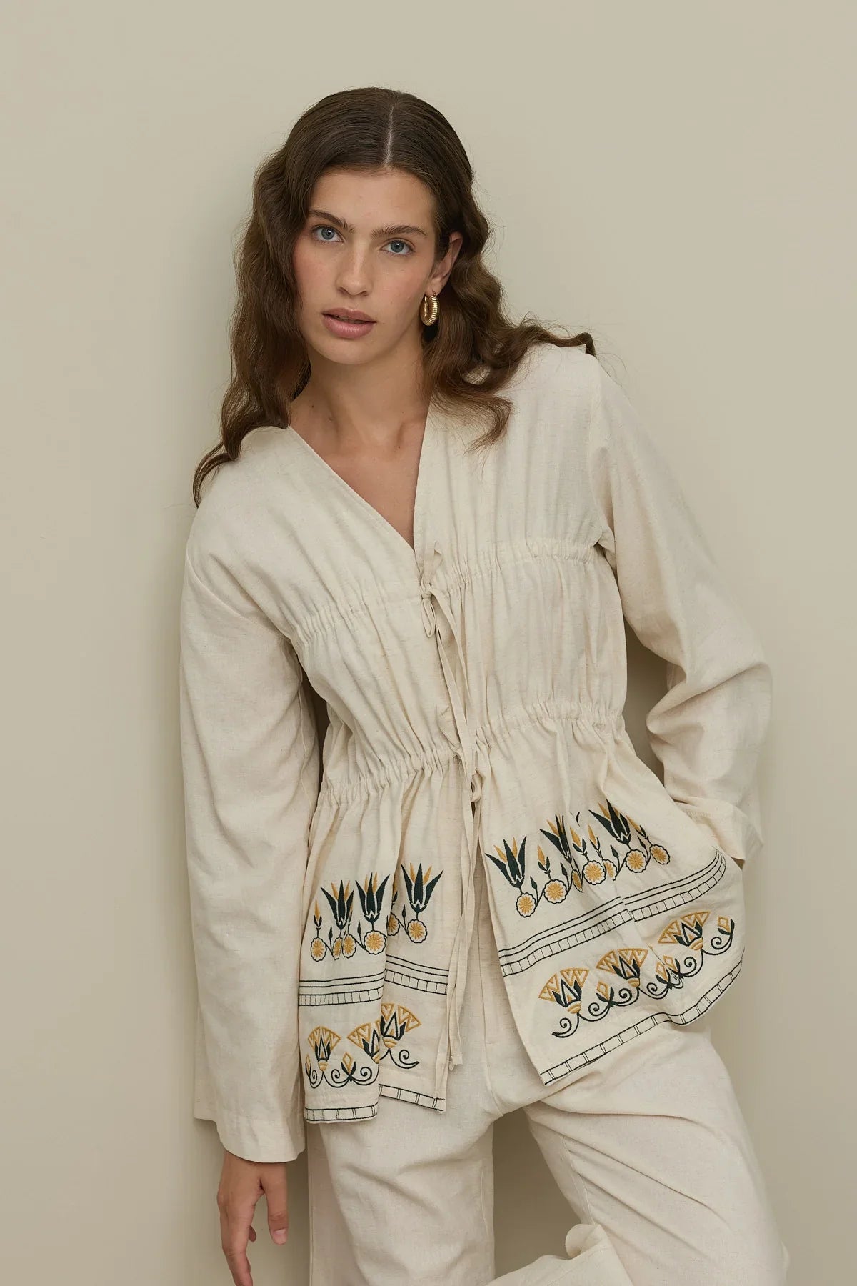 Featuring a front gathered detail, a fabric blend of linen, embroidered details, a wide-sleeved kimono, and culotte-style pants with embroidered hems.