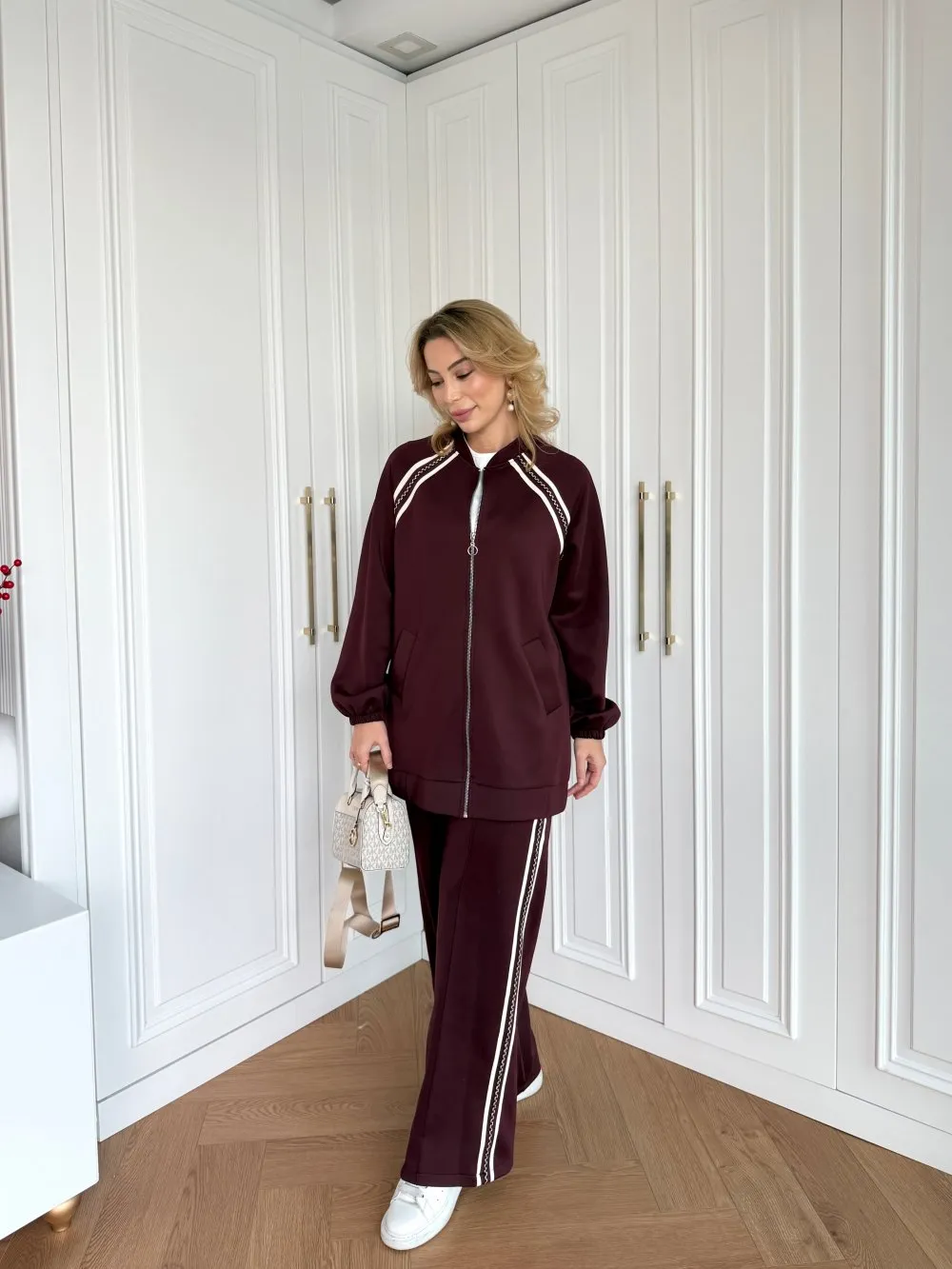 Jacket made from premium scuba fabric. Features full-length zipper, pocket details, dropped shoulders, stripe accents, and elastic cuffs. Pants have elastic waistband and stripe detailing. Measurements: Jacket length 84cm, chest 57cm. Pants length 111cm, waist 32cm.