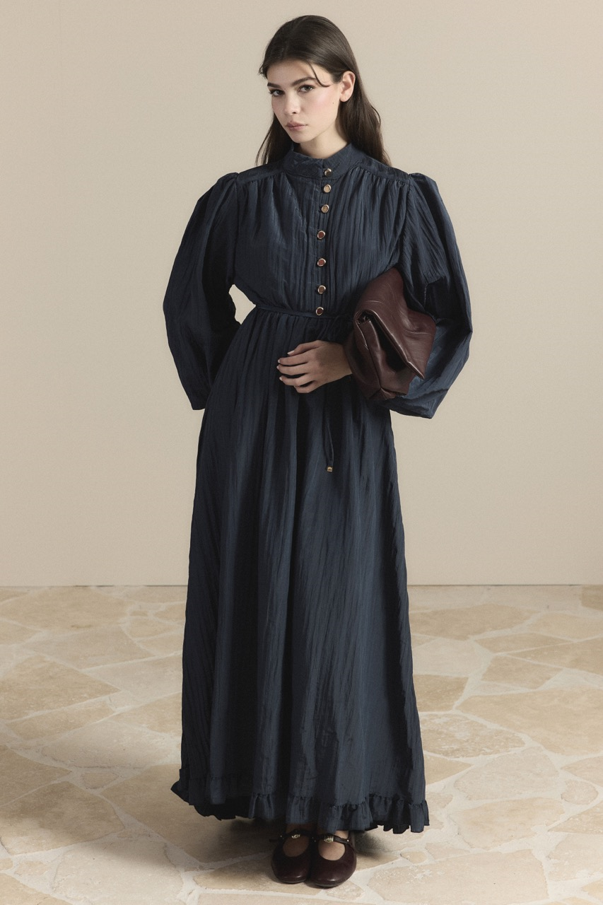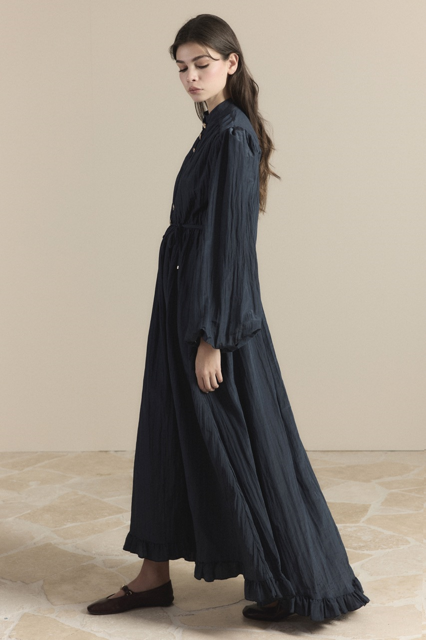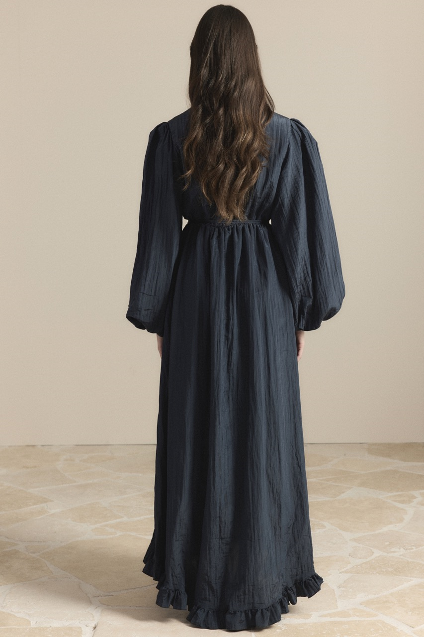 Elevate your wardrobe with this chic asymmetric dress featuring elegant ruffles and pleats. The sophisticated navy hue offers timeless versatility, perfect for creating standout looks for any occasion. Crafted with attention to detail for a flattering fit and premium feel.