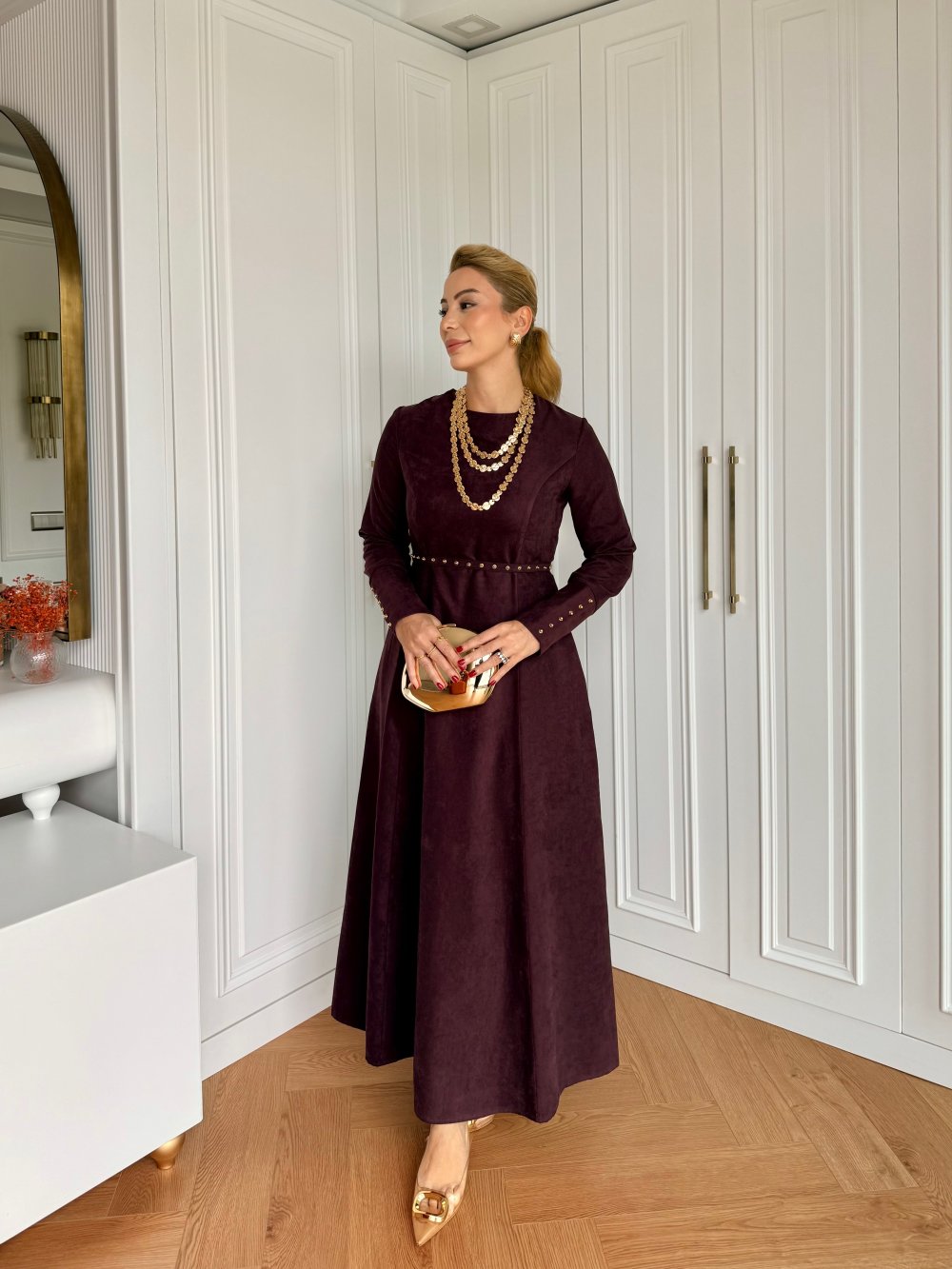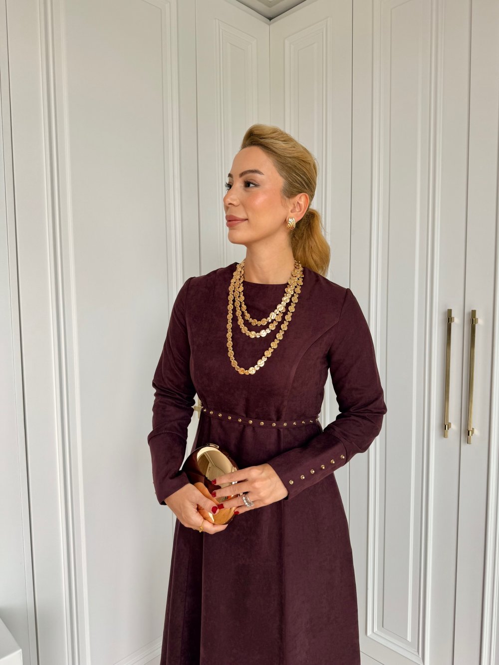 Tags: belted dress, elegant dress, mandarin collar, suede dress, women's fashion