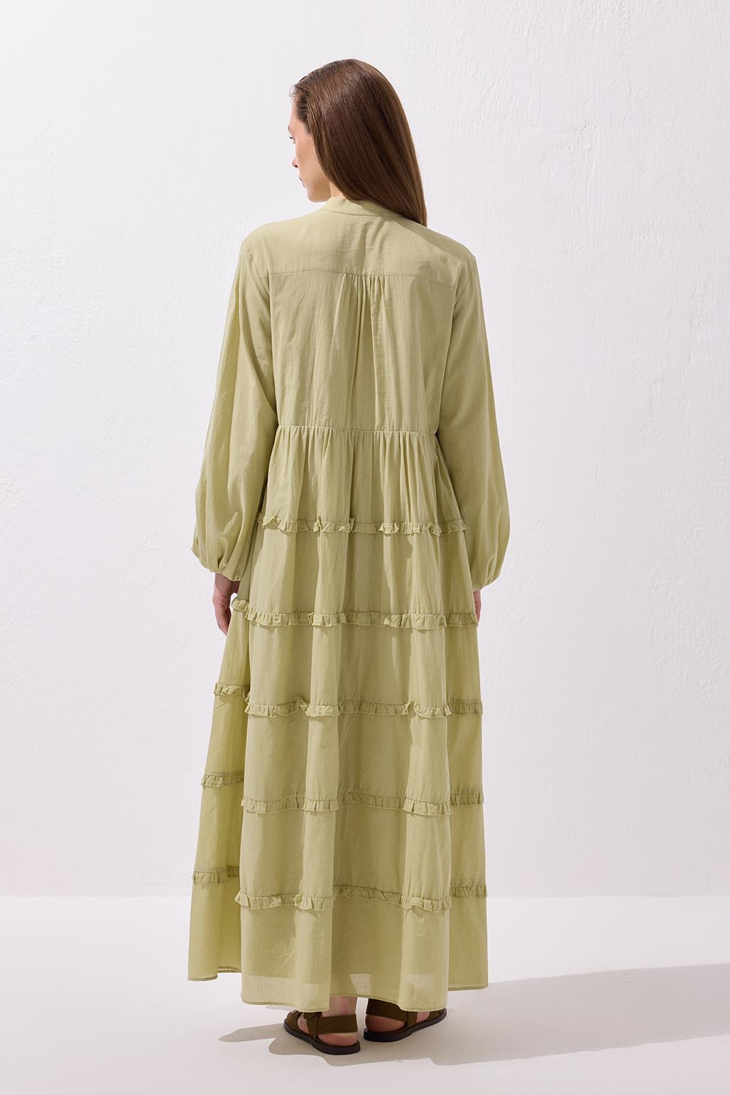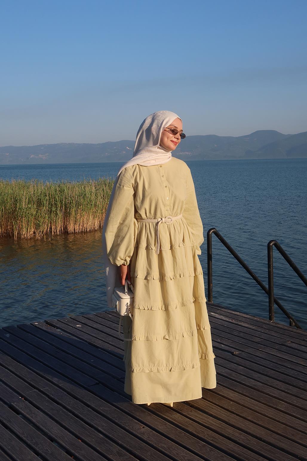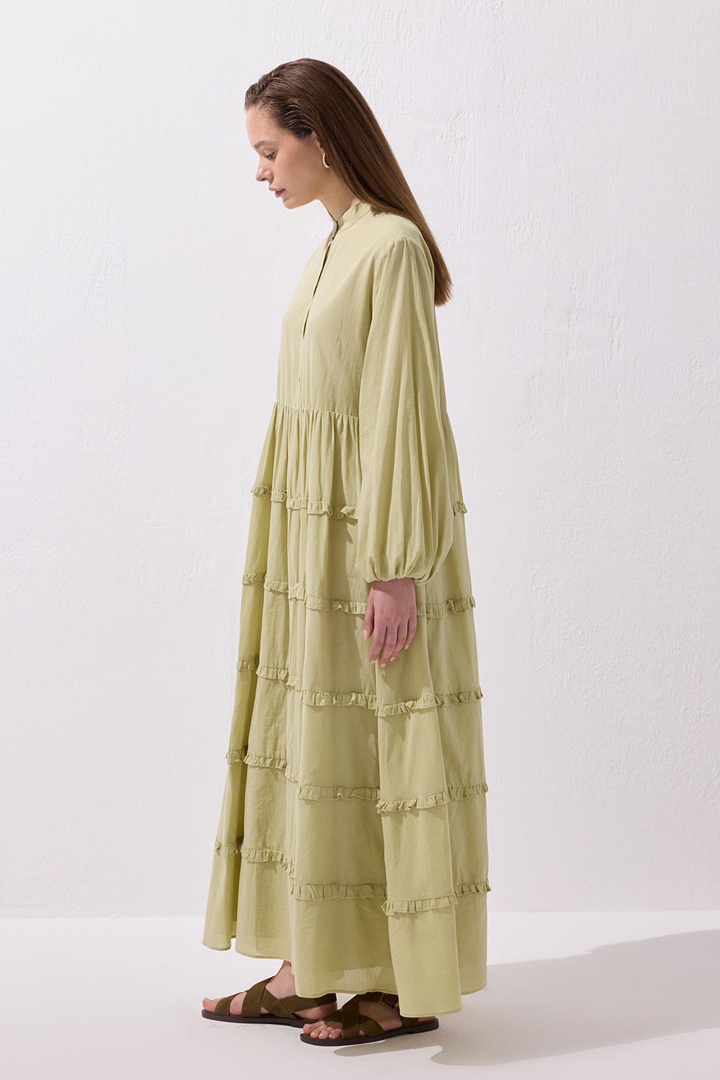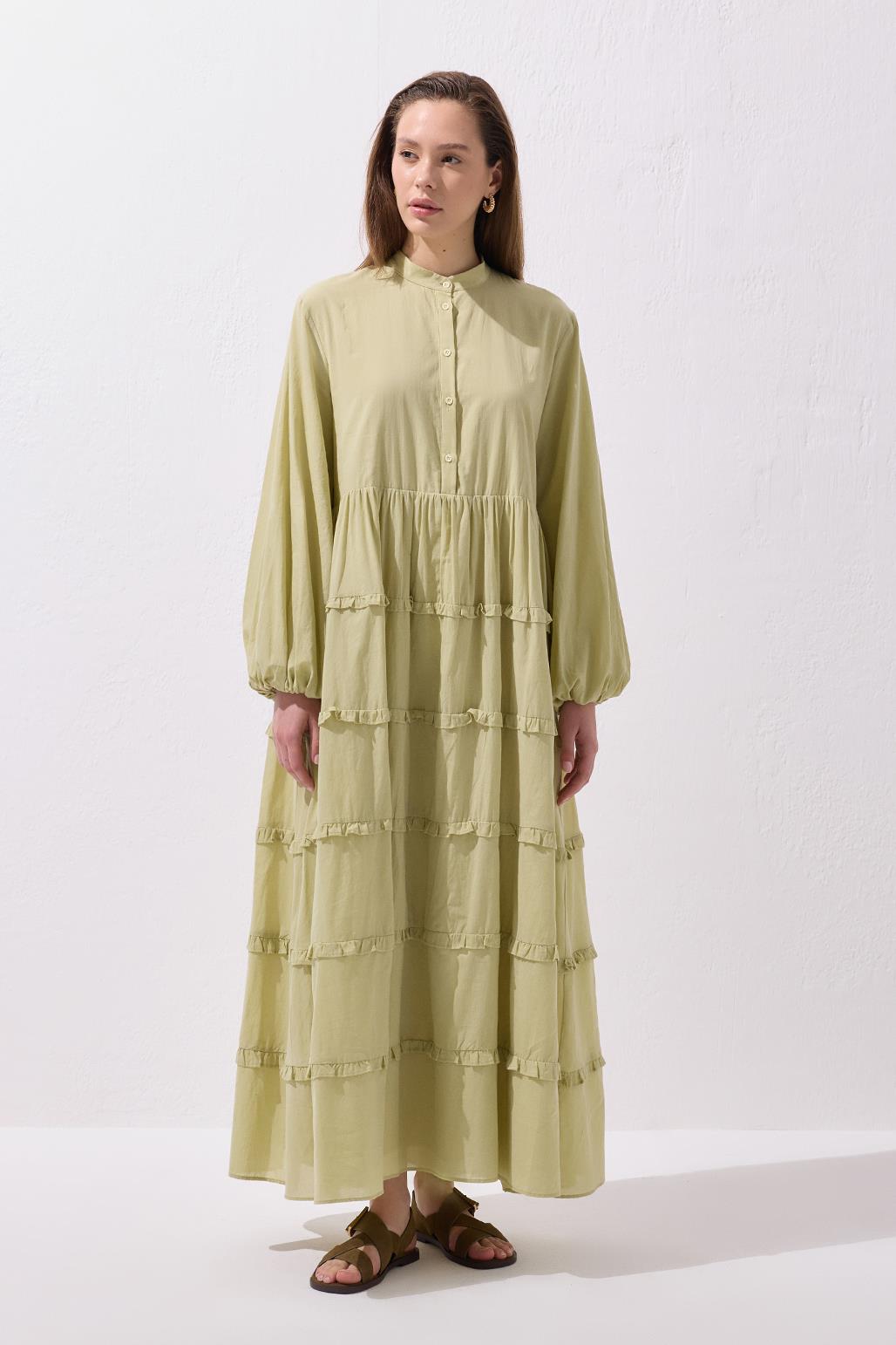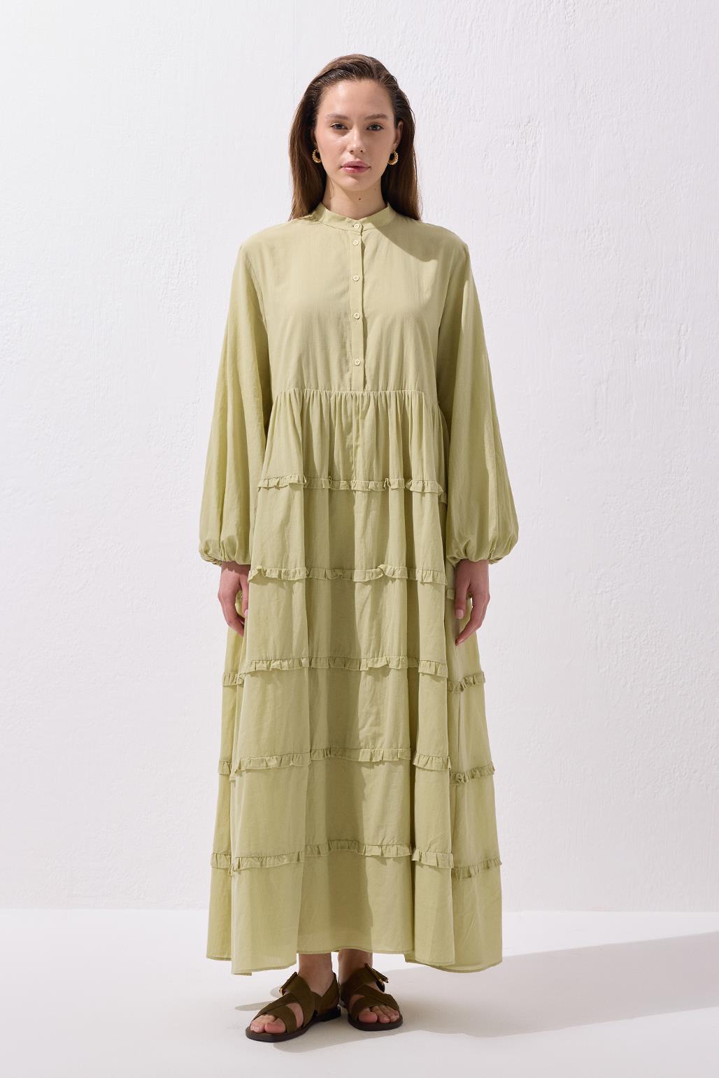 Azur Vual Katlı Uzun Elbise Çağla, pamuk vual kumaşının hafifliği ve nefes alabilirliği ile yaz boyunca rahatlık sağlar. İnce kumaşı, vücuda nazikçe otururken size özgürlük sunar. Yarım patlı düğme kapanma ve dik yaka, elbiseye zarif bir hava katarken, katlı kesim ve firfir detayları da modern ve feminen bir görünüm oluşturur. Balon kol yapısı ve lastikli kol uçları, şıklığı ve rahatlığı bir arada sunarak gün boyu rahatlıkla kullanılabilir. Özellikle yaz akşamlarında ya da özel davetlerde, her ortamda rahatça kombinlenebilirliği sayesinde favori parçalarınızdan biri olacak!