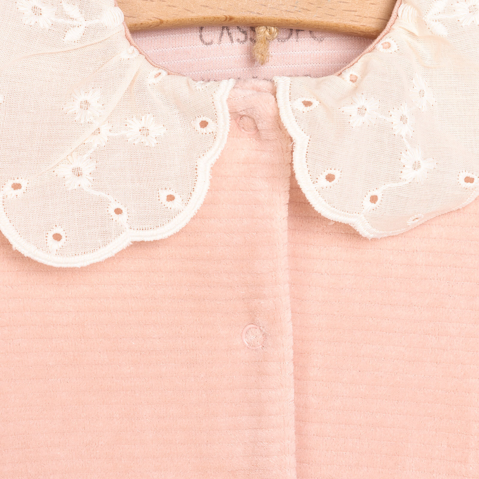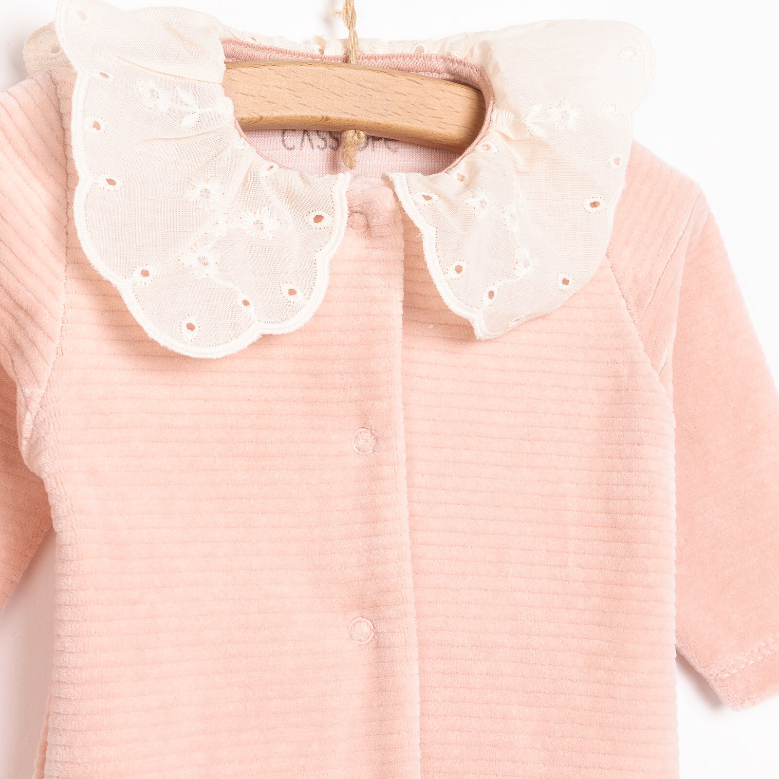 Baby Girl Velvet Footed Romper with Patterned Collar, Footless Legs, Long Sleeves in Rose Quartz