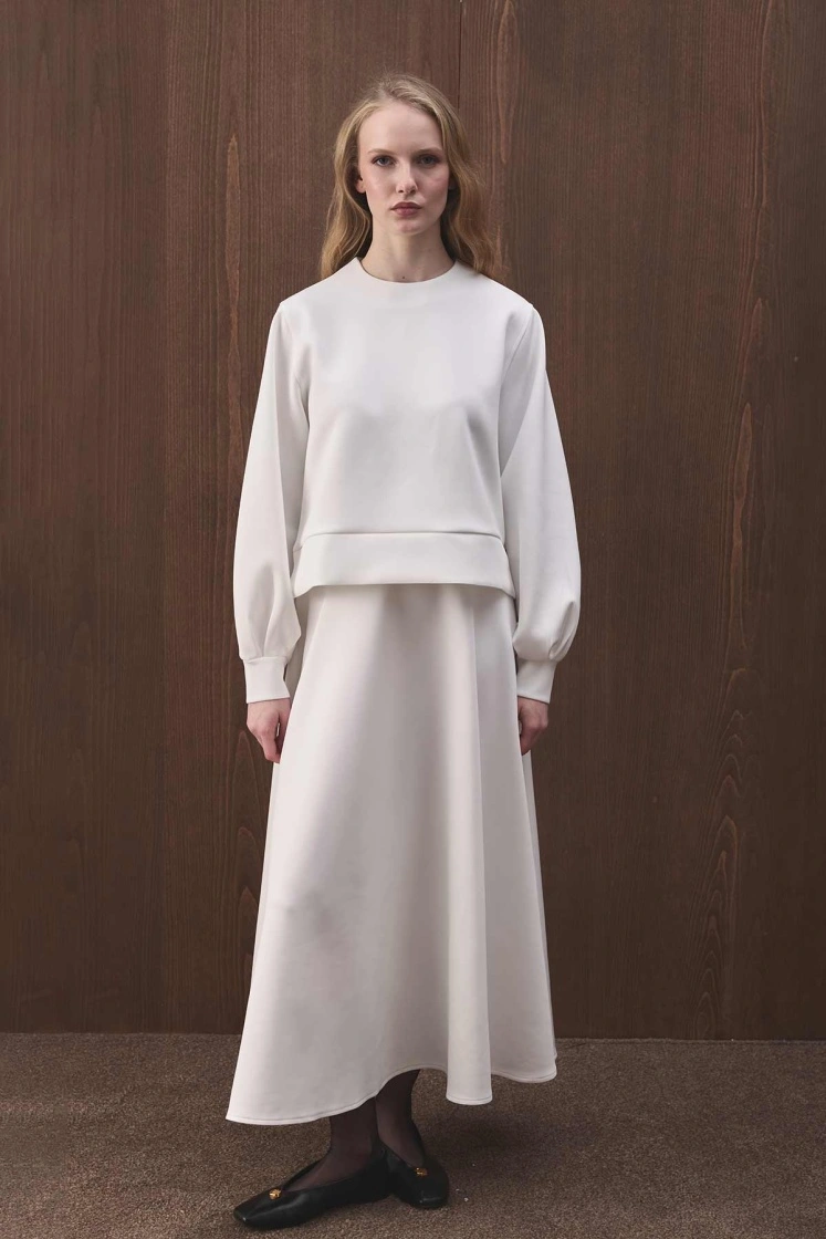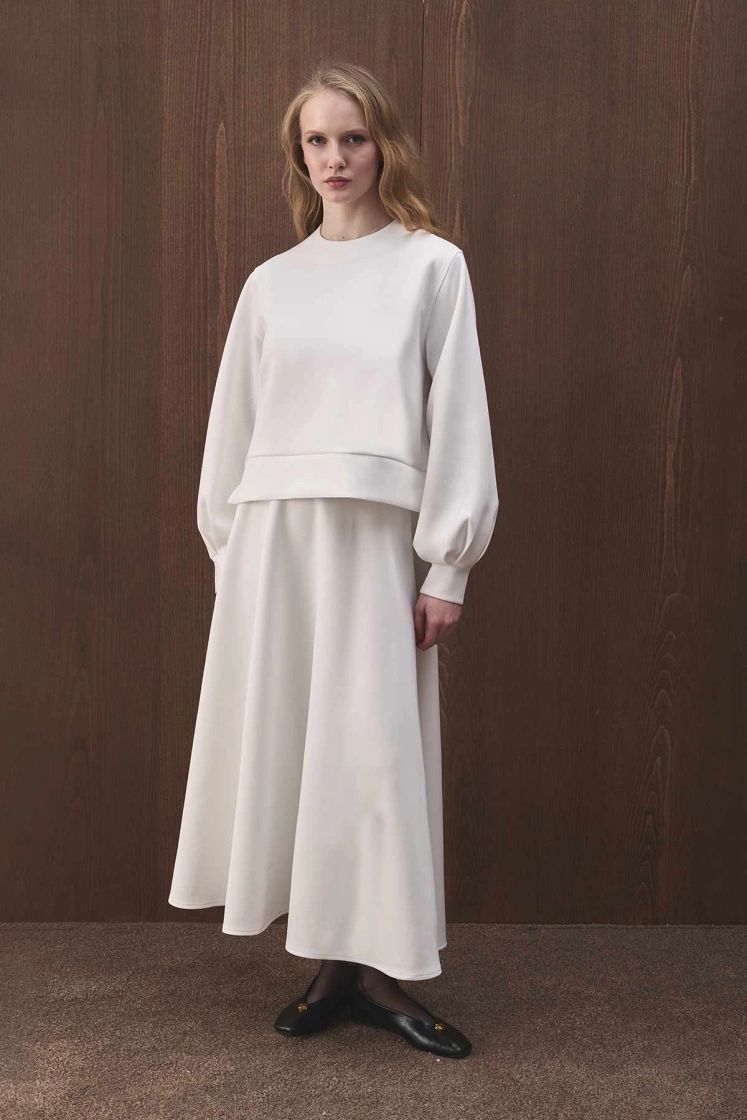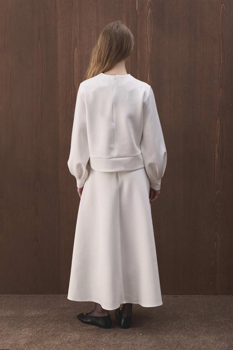 Tags: balloon sleeve, beige, flared skirt, pleated sleeves, scuba fabric, skirt set, women's fashion