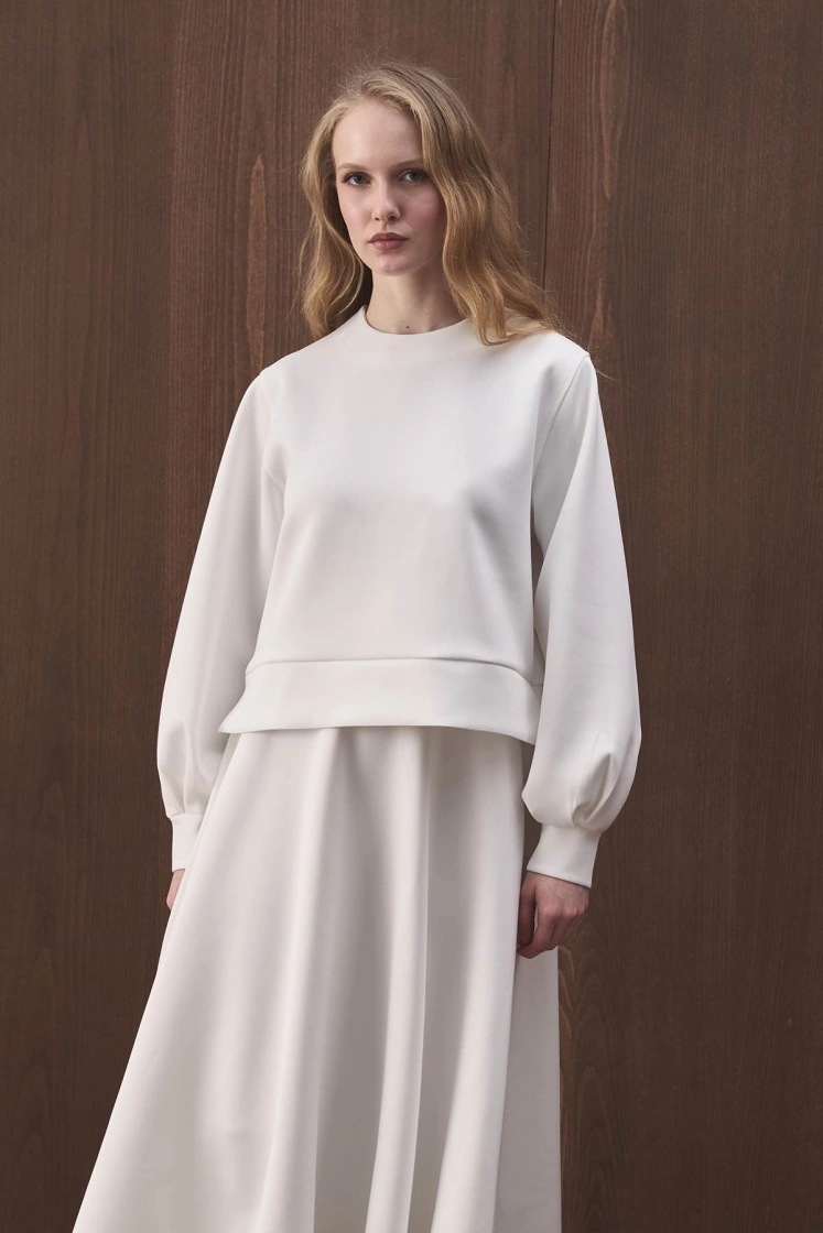 BALLOON SLEEVE SCUBA BEIGE SKIRT SET FEATURES: Bicycle collar, back zipper closure, balloon sleeves with pleated detailing, skirt with front belted waist and back elastic, back zipper closure, flared silhouette, basic model balloon sleeve scuba skirt set. CONTENT AND CARE: 93% Polyester, 7% Elastane. Wash at 30°C on delicate, synthetic, and gentle cycles. Hand measurements may vary by 2-3 cm. Model Size: S-M. Model Measurements: Height: 174 cm, Bust: 78 cm, Waist: 58 cm, Hips: 87 cm