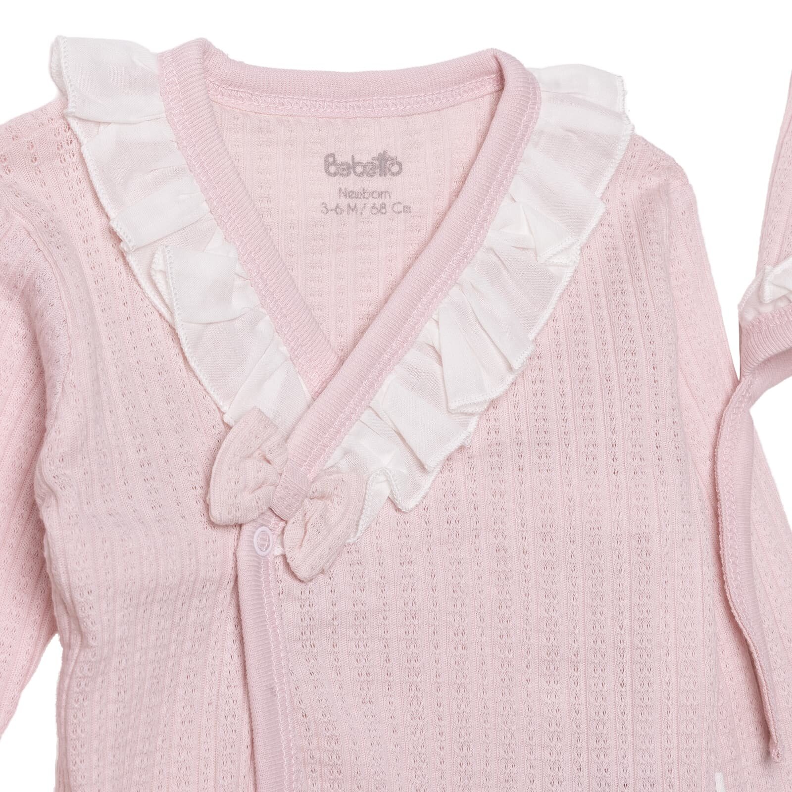 Bebetto girls baby bodysuit, hat and bootie set offers soft, breathable comfort for your baby’s delicate skin with its 100% cotton fabric. Featuring a Sweet Princess design with ruffled collar detail, long sleeves and long pants structure, it provides both stylish and comfortable wear. With its snap-closure bodysuit and matching pieces, this set is ideal for daily baby wear.