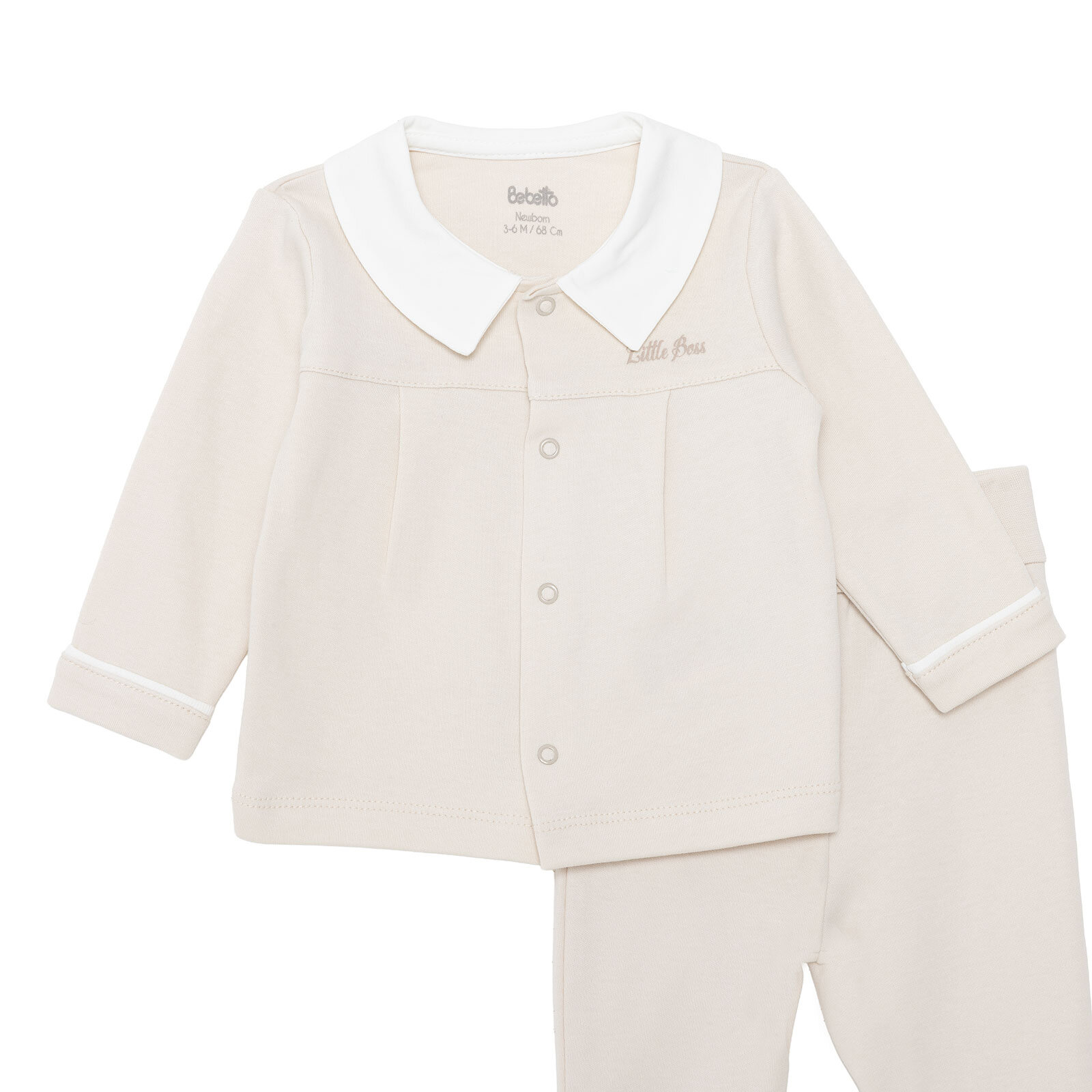 The Bebetto Little Boss newborn boys’ cardigan-bootie bottom set combines stylish design with everyday practicality, featuring a collared neckline and snap-button closures for easy dressing. Made from 100% cotton with a soft texture, it offers gentle comfort for your baby’s delicate skin and can be used safely from day one.