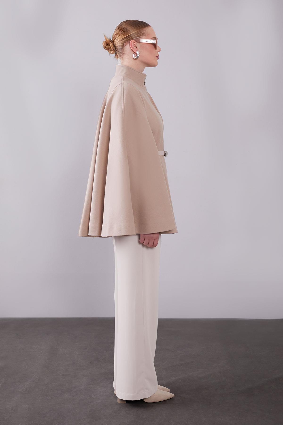 With its elegant design and functional structure, this hidden belt detail poncho brings sophistication to outerwear, creating a striking silhouette in your outfits. The hidden belt detail on the inside gives the poncho a modern form-fitting shape that makes you appear slimmer. Thanks to its comfortable cut, it offers a comfortable experience both in daily wear and in special combinations. Ideal for seasonal transitions, this poncho model keeps you warm in cool weather without compromising your style. You can easily pair our new season poncho with pants, dresses, and skirt combinations. With its chic and minimal details, this new poncho stands out as a strong outerwear alternative that complements modern women’s style.