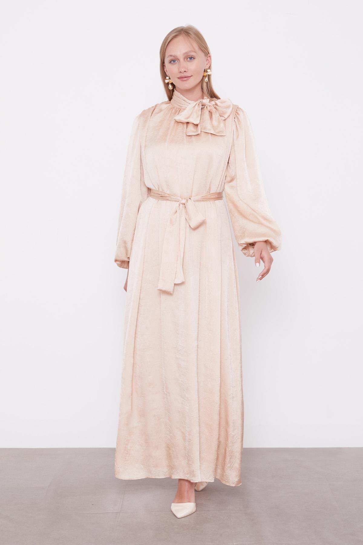 This crinkle satin dress with sash detail is a favorite among fashion enthusiasts, offering a special design that combines elegance and comfort. The lightly shiny and textured crinkle satin fabric provides a noble appearance while attracting attention with its dynamic structure. The bow-tie neck detail adds an elegant sparkle to the dress, while the soft texture of the crinkle satin ensures all-day comfort. Ready to be the savior piece in your wardrobe, our model offers wide versatility from office elegance to party outfits. Complete the look with elegant heels, a simple clutch bag, and natural-toned makeup for a stunning appearance. You can achieve a sophisticated look by pairing it with new season scarves or light jackets according to the season.