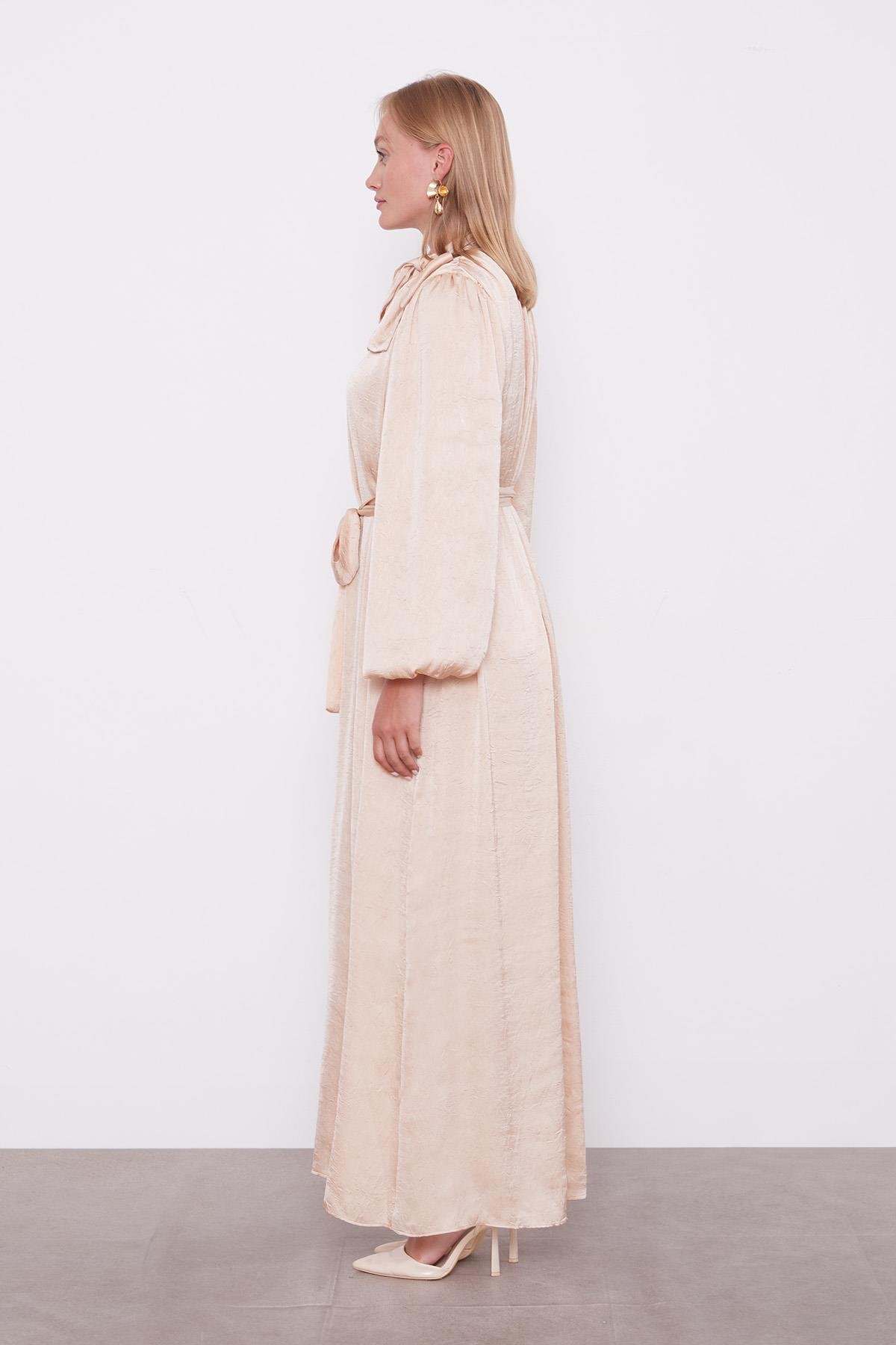 Beige Sash Detail Crinkle Satin Dress