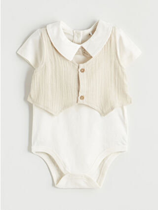 Beige Vest-Style Muslin Snapsuit Bodysuit and Pants Set for Baby Boys