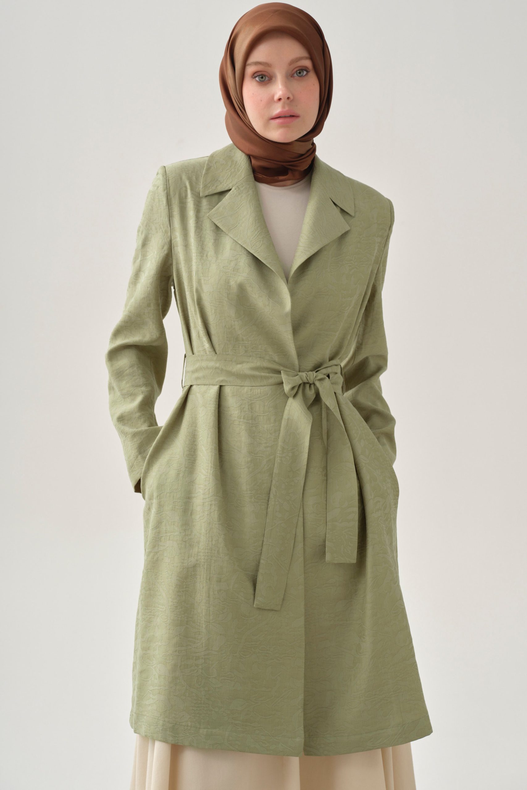 This jacket offers a feminine silhouette with its elegant jacquard texture and belt detail, bringing sophistication to the forefront. It provides a wide range of use from special occasions to daily outfits.