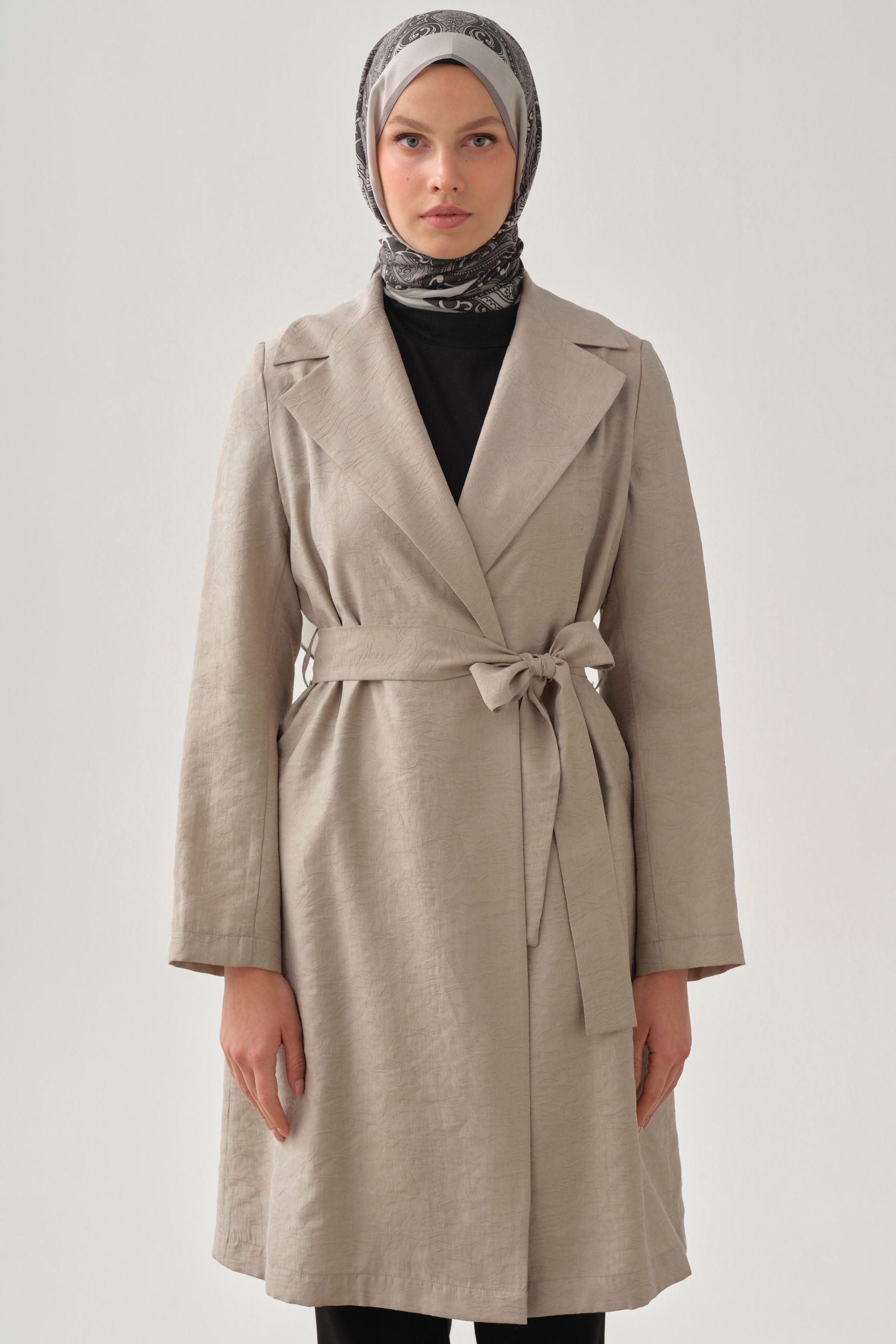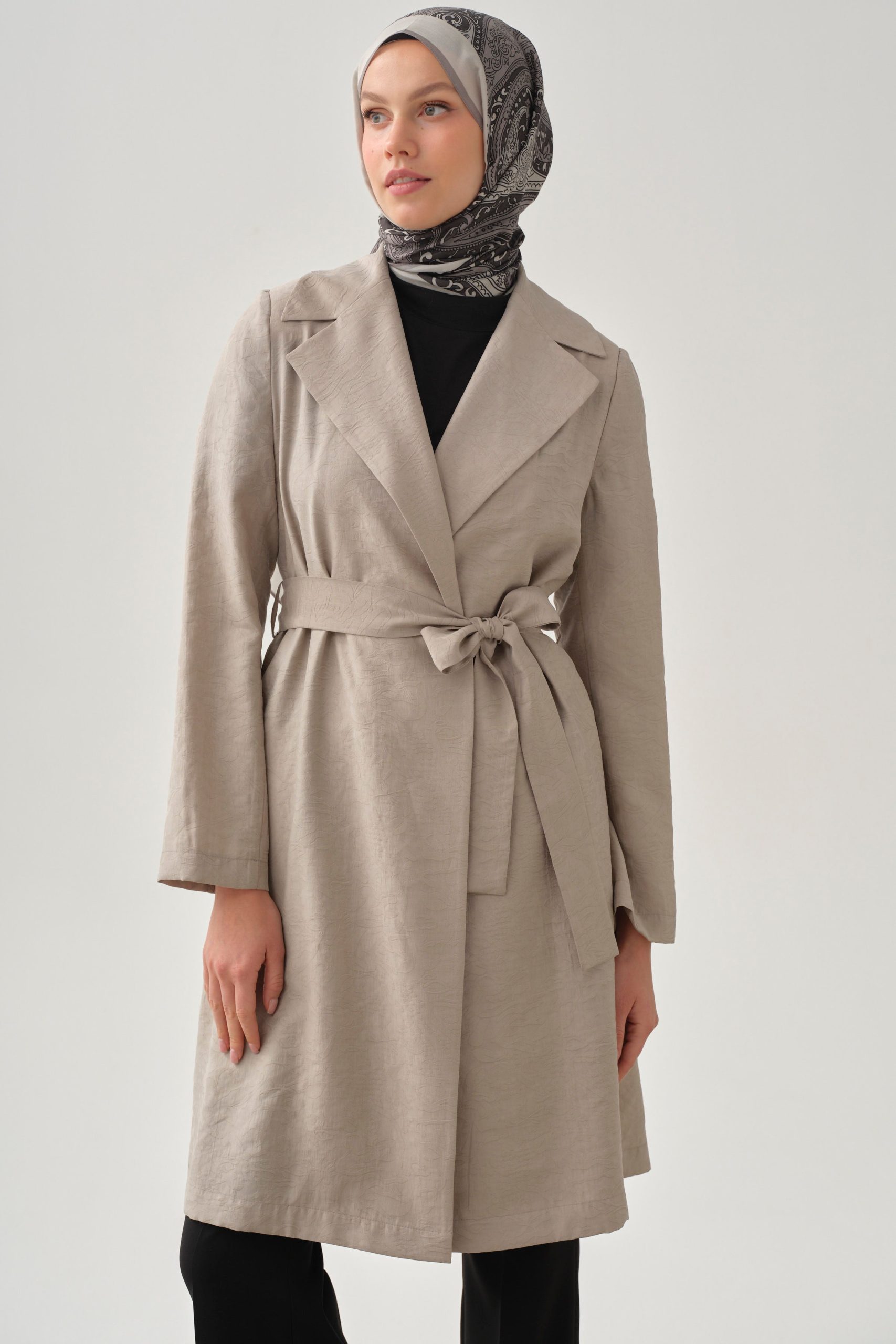 Featuring an elegant jacquard texture and a belt detail, this jacket offers a feminine silhouette that highlights style. It provides a wide range of use from special occasions to everyday outfits.