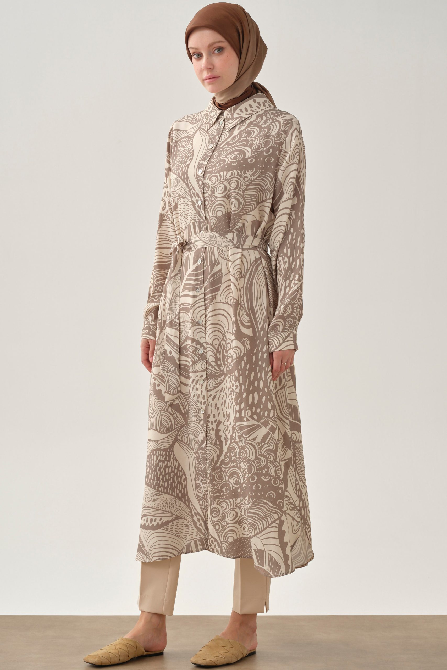 Offering a feminine silhouette with its elegant patterns and belt detail at the waist, this long tunic combines style and comfort. It is an ideal choice for both everyday and special outfits.